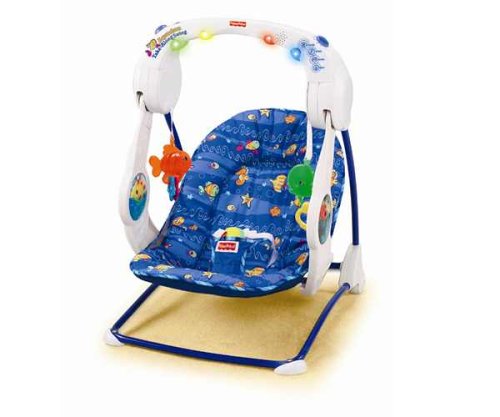 Not only does a swing like this let you take babyÆs favorite soother wherever you go, it also lets you take an aquarium along! The swinging motion makes the fishies in the colorful tanks look like theyÆre swimming. So baby is soothed by watching fishy friends in an aquarium plus eight different swing speeds. And baby can pull on one of the hanging sea creature friends for music & dancing lights! For mom, itÆs portable and compact, with a convenient handle that lets you carry it safely from room to room. So much soothing in a portable, compact size! Swinging motion makes fishies ôswimö! Plays classical music and soothing aquatic sound effects Baby can activate music & dancing lights! 8 speeds for babyÆs comfort Deep cradle seat supports baby Easy-carry handle lets you take it safely from room to room Non-Slip feet hold swing securely. Machine washable seat pad. Hanging toys and soft toy in pocket encourage sensory development Folds compactly to take anywhere NOTE: Weight limit 25 lbs.