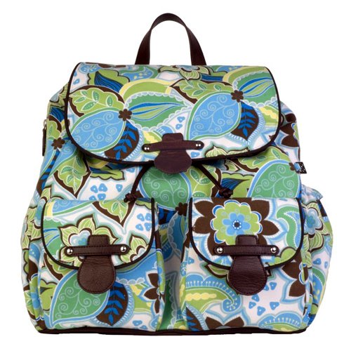 Having a baby brings a lot of changes but it doesn't mean you have to change your style. The Backpack design provides a great everyday bag for mom and baby. It features easy-care canvas with chocolate nylon lining for quick and easy cleaning; flat-top closure with magnetic snap lock; two front pockets with leather detail allows for easy access of cell phone, pda, keys, etc; leather trim handle and pockets, antique nicket handware; and protective feet on the bottom. This hip yet sophisticated backpack also includes everything the on-the-go mom needs: a large padded micro fiber changing pad for quick pit stops, an insulated bottle holder, a hard case for wipes, and a pvc zipper "wet" bag to separate clean from dirty items. It's functional as it is fashionable! Measures 15" high, 16" wide, 10" deep.
